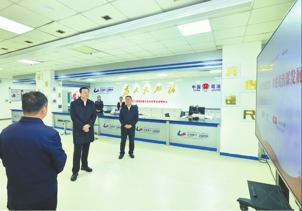 11月18日下午,自治区党委副书记、市委书记张柱深入天山区调研安全稳定和基层治理工作。图为在二道桥街道,张柱察看群众办事窗口,同基层干部亲切交流,详细询问群众办事情况。(记者陈星宇)