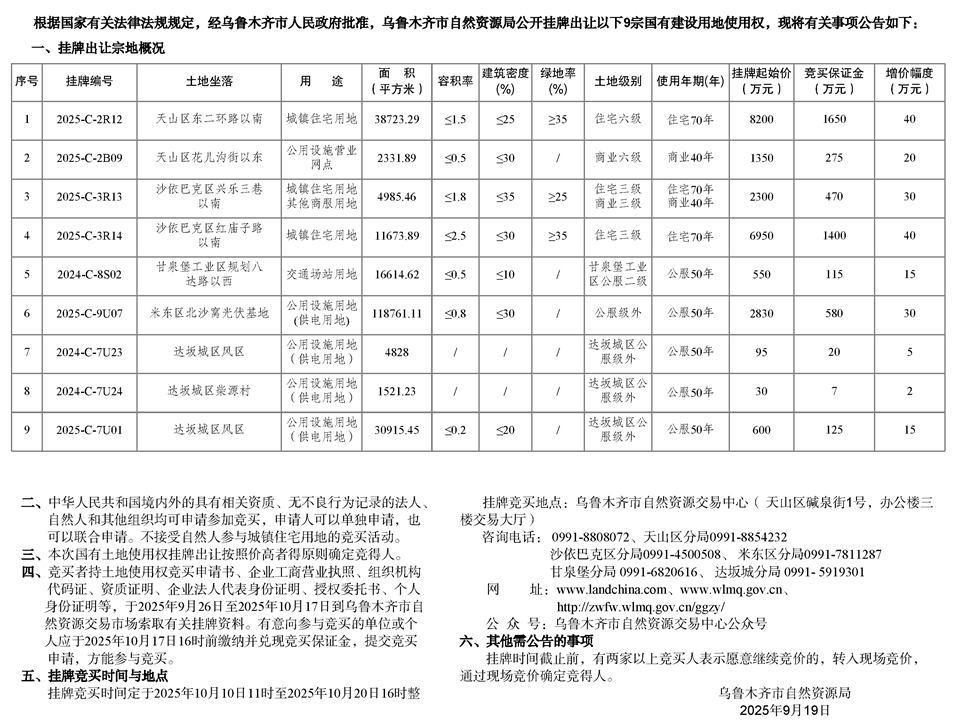 乌鲁木齐市自然资源局国有建设用地使用权挂牌出让公告市自然挂告字〔2025〕32号