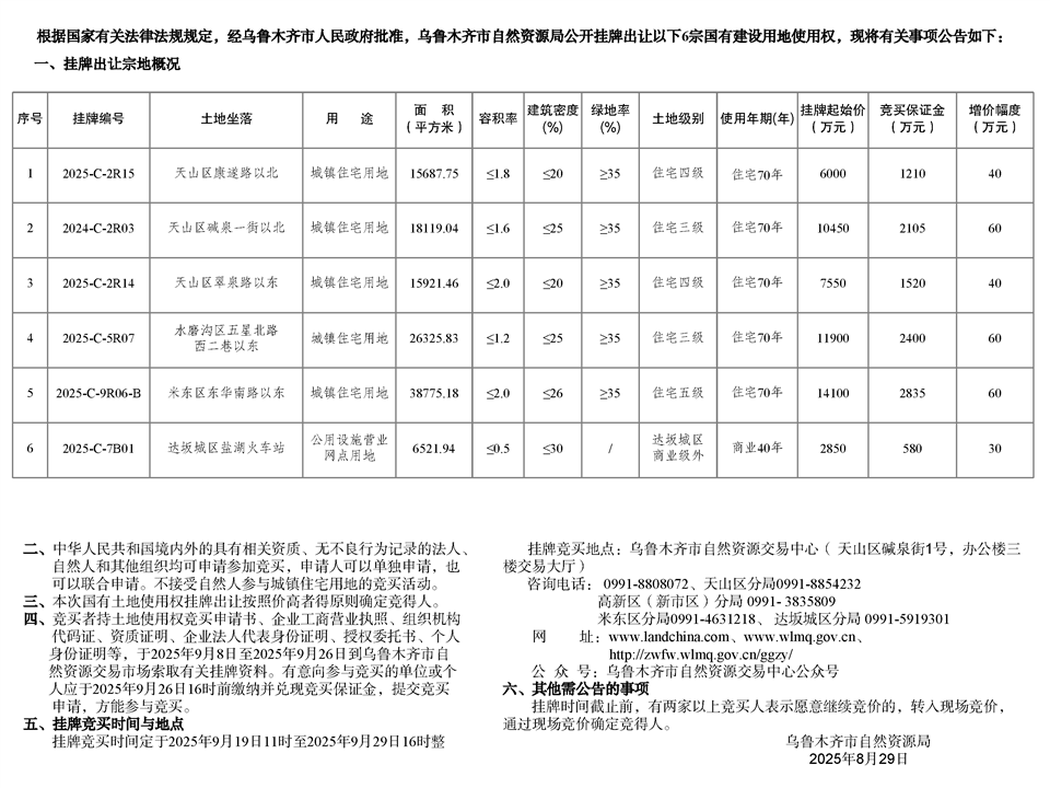 乌鲁木齐市自然资源局国有建设用地使用权挂牌出让公告市自然挂告字〔2025〕30号
