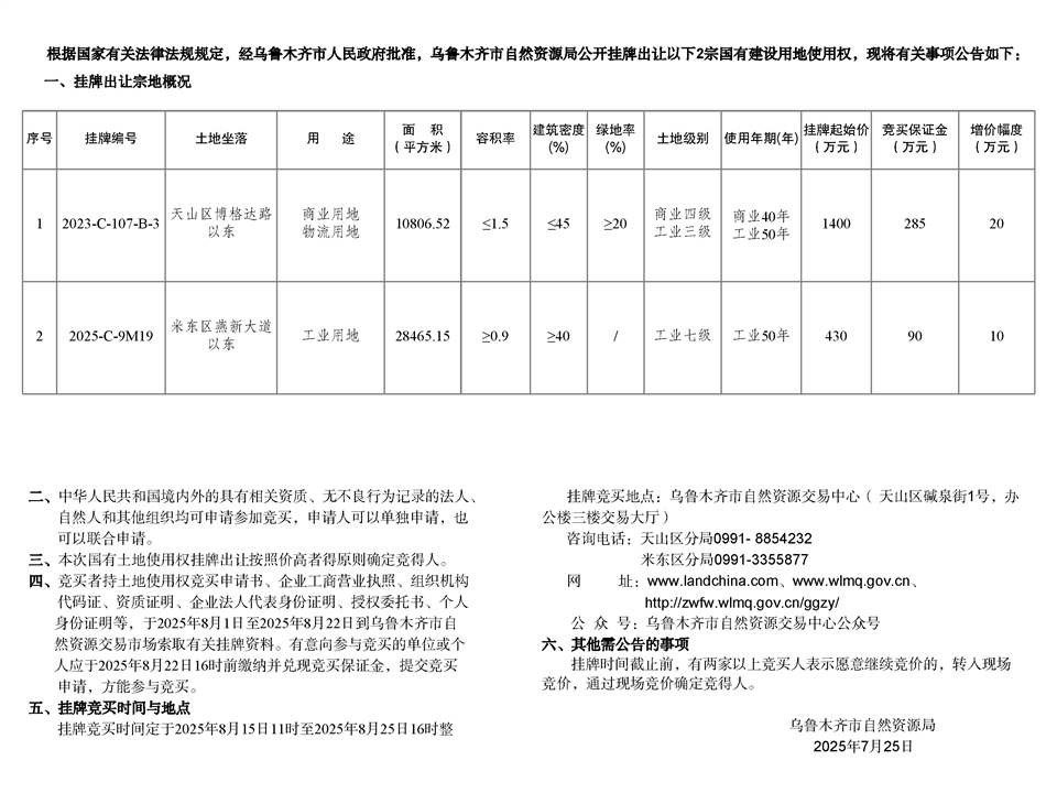 乌鲁木齐市自然资源局国有建设用地使用权挂牌出让公告市自然挂告字【2025】26号