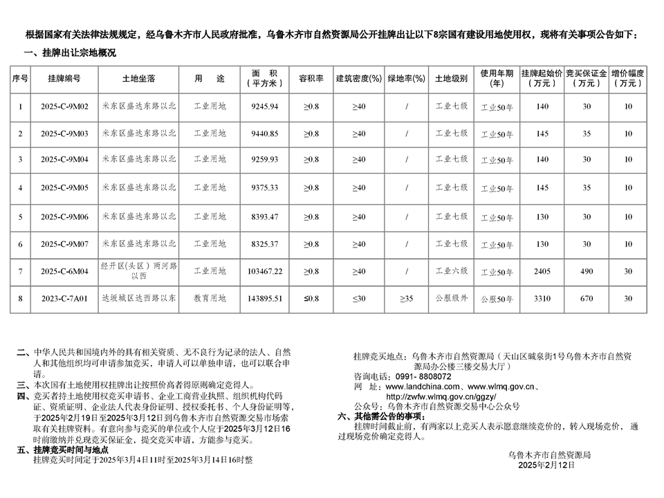 乌鲁木齐市自然资源局国有建设用地使用权挂牌出让公告 市自然挂告字【2025】4号